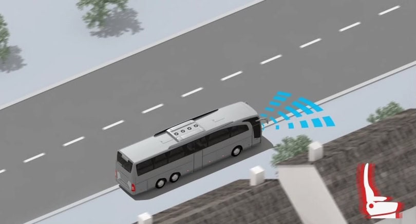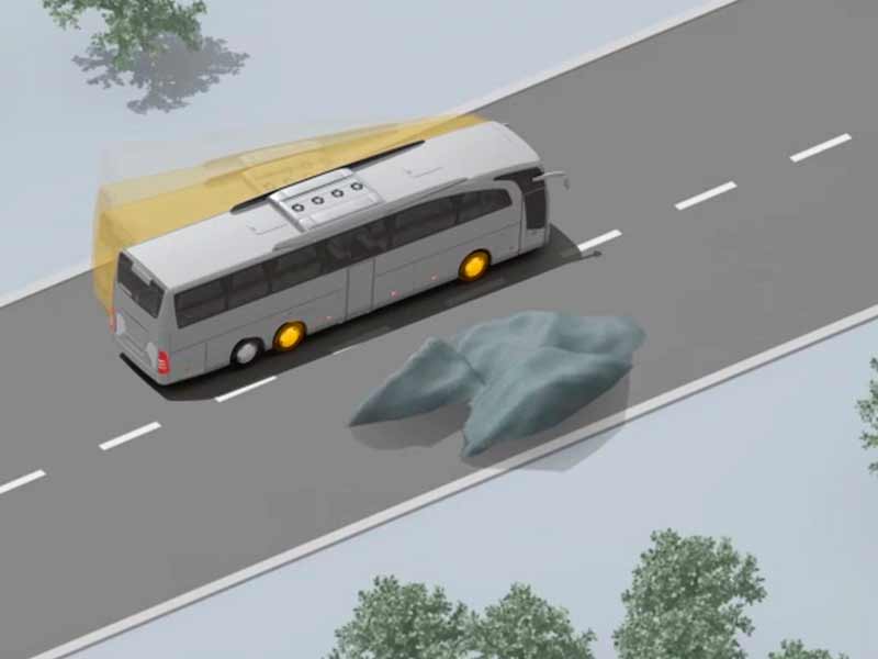 El ESP supervisa además la aceleración transversal del autobús. Si el vehículo alcanza una situación crítica en curvas prolongadas, como una salida de autopista, o durante un cambio rápido de carril, se reduce automáticamente la velocidad del autobús hasta que ha recuperado la estabilidad. El programa electrónico de estabilidad es comparable con el sistema utilizado en los turismos, pero cuenta con funciones ampliadas, adecuadas al uso en un autobús.